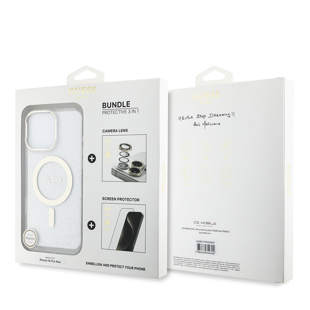 Apple iPhone 16 Pro Max Guess Orjinal Lisanslı 3'lü Aksesuar Seti IML Baskılı Simli Glitter Kılıf + Ekran Koruyucu + Lens Koruyucu Şeffaf