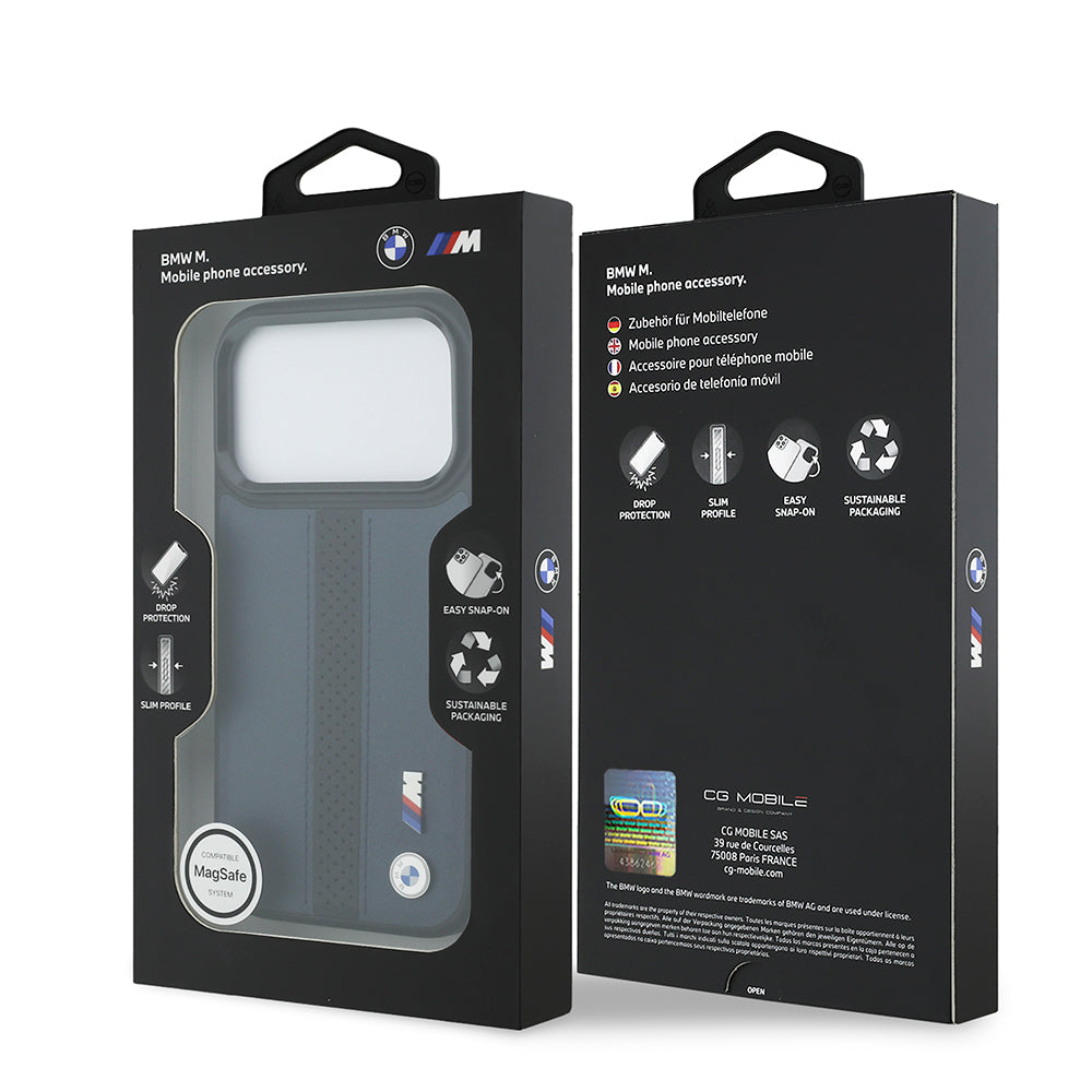 iPhone 17 Pro Kılıf BMW Orjinal Lisanslı M-safe Şarj Özellikli Deri Arka Yüzey Metal Logolu Delikli Şerit Tasarımlı Kapak