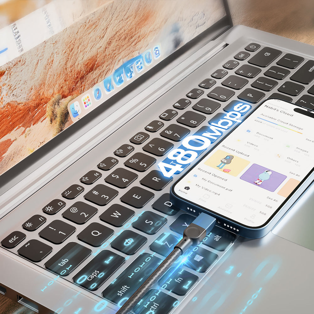Sadece şarj için değil, aynı zamanda veri transferi için de ideal bir çözümdür. 480Mbps hızında veri aktarımı sağlayarak fotoğraf, video ve belgelerinizi saniyeler içinde cihazlarınız arasında güvenle taşımanıza yardımcı olur. Günlük işlerinizi hızlandıran bu kablo, hem evde hem de profesyonel kullanımda size üstün performans sunar.
