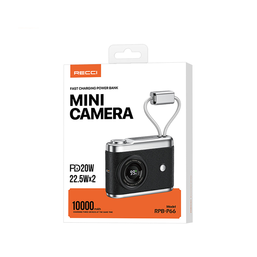 Recci RPB-P66, klasik kamera görünümündeki şık tasarımıyla farkını ortaya koyuyor. Deri dokulu dış yüzeyi, hem zarif bir görünüm sunar hem de elde tutuş konforunu artırır. Sadece kart boyutundaki kompakt yapısıyla cebinizde, çantanızda veya avuç içinde rahatlıkla taşınabilir. İster evde çalışma masanızda kullanın, ister dışarıda gün boyu telefonunuzu şarj etmek için yanınızda taşıyın; bu şarj cihazı her zaman şıklığınızdan ödün vermez.