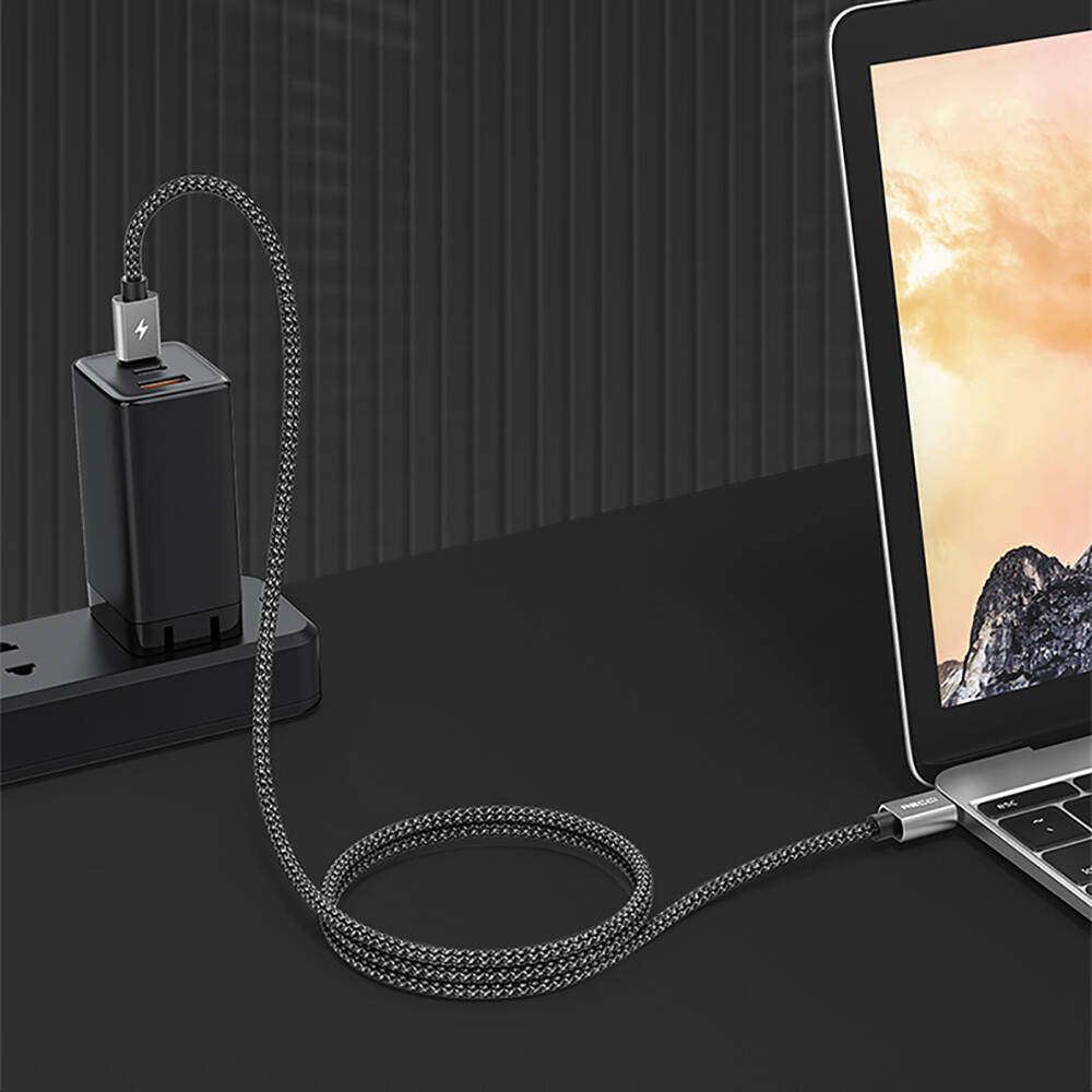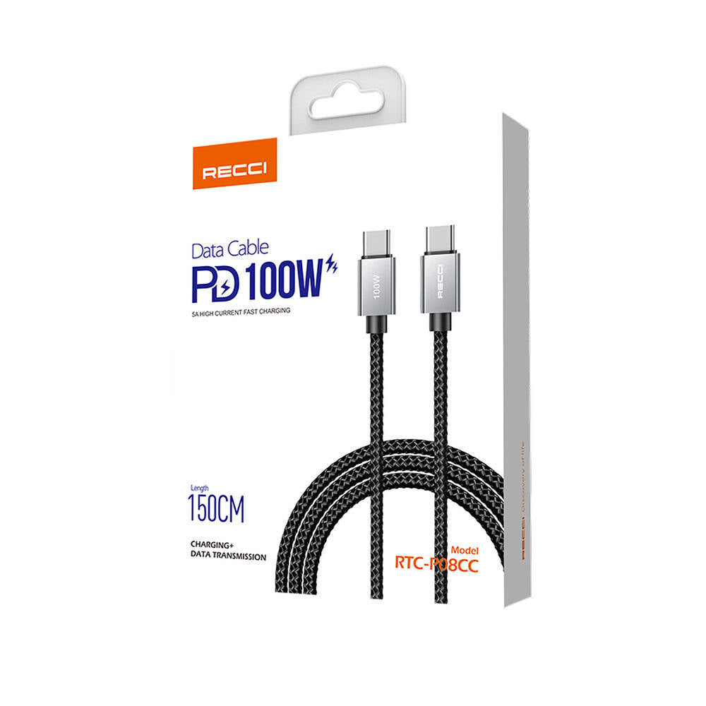 Recci RTC-P08CC Type-C to Type-C PD 100W 5A Hızlı Şarj Naylon Örgü Tasarım Şarj ve Data Kablosu 1.5M Siyah