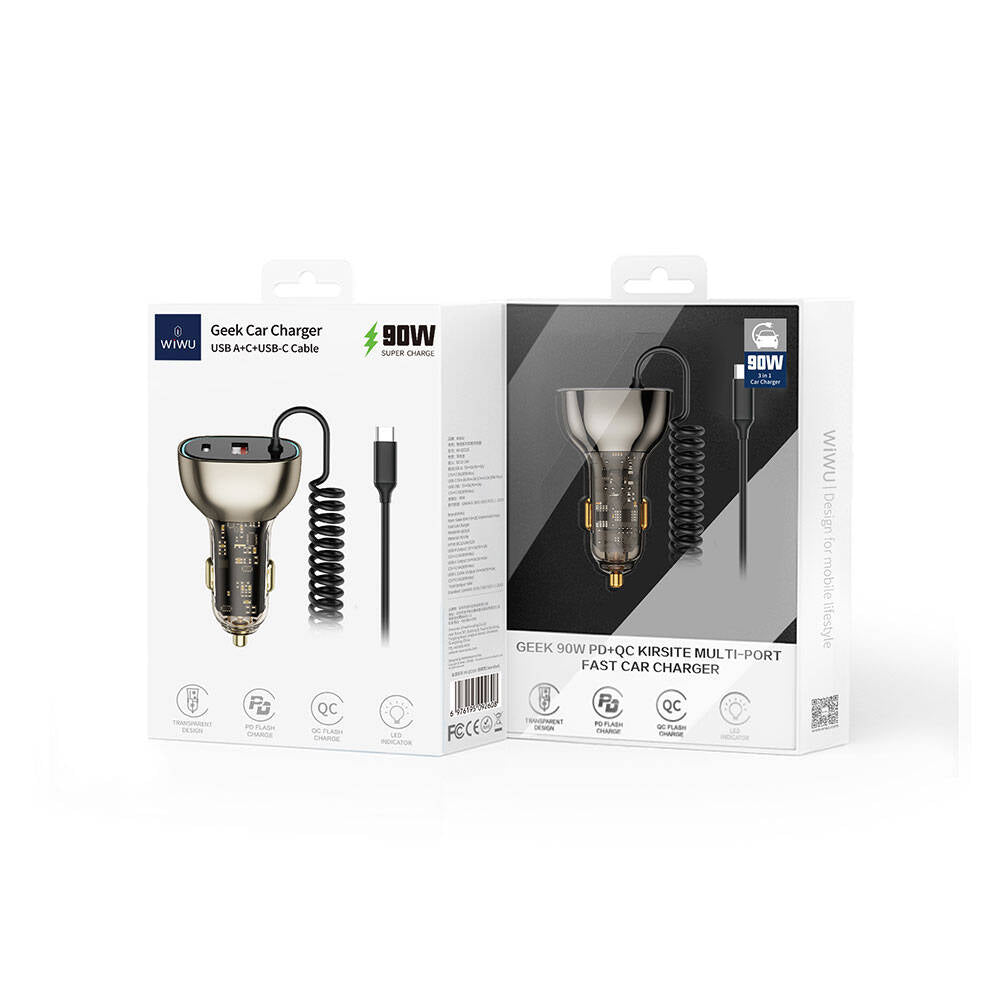 Wiwu Wi-QC016 Geek Serisi Type-C + Type-C Kablolu + USB-AHızlı Şarj Özellikli Transparan Tasarımlı Araç Şarj Aleti 90W